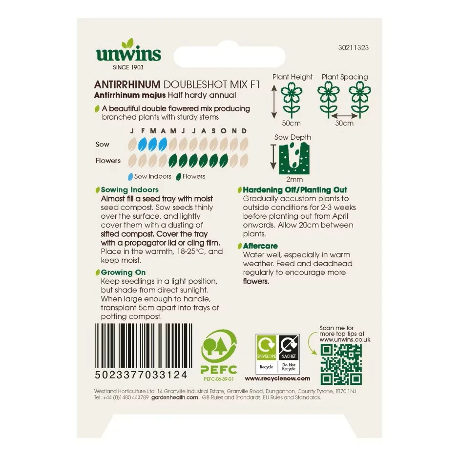 Shop for Antirrhinum Doubleshot Mix at Jones Garden Centre, where we present an extensive selection of Flower Seeds available online. Prefer the hands-on approach? Visit our garden centre in Donabate to witness Antirrhinum Doubleshot Mix in person. Our dedicated team of experts is ready to assist you with any queries. If you haven't discovered the precise item you were seeking, don't worry. Our webshop boasts over 3000 items, ensuring you'll always come across fantastic deals and delightful gifts. Explore the categories below to discover more products.
