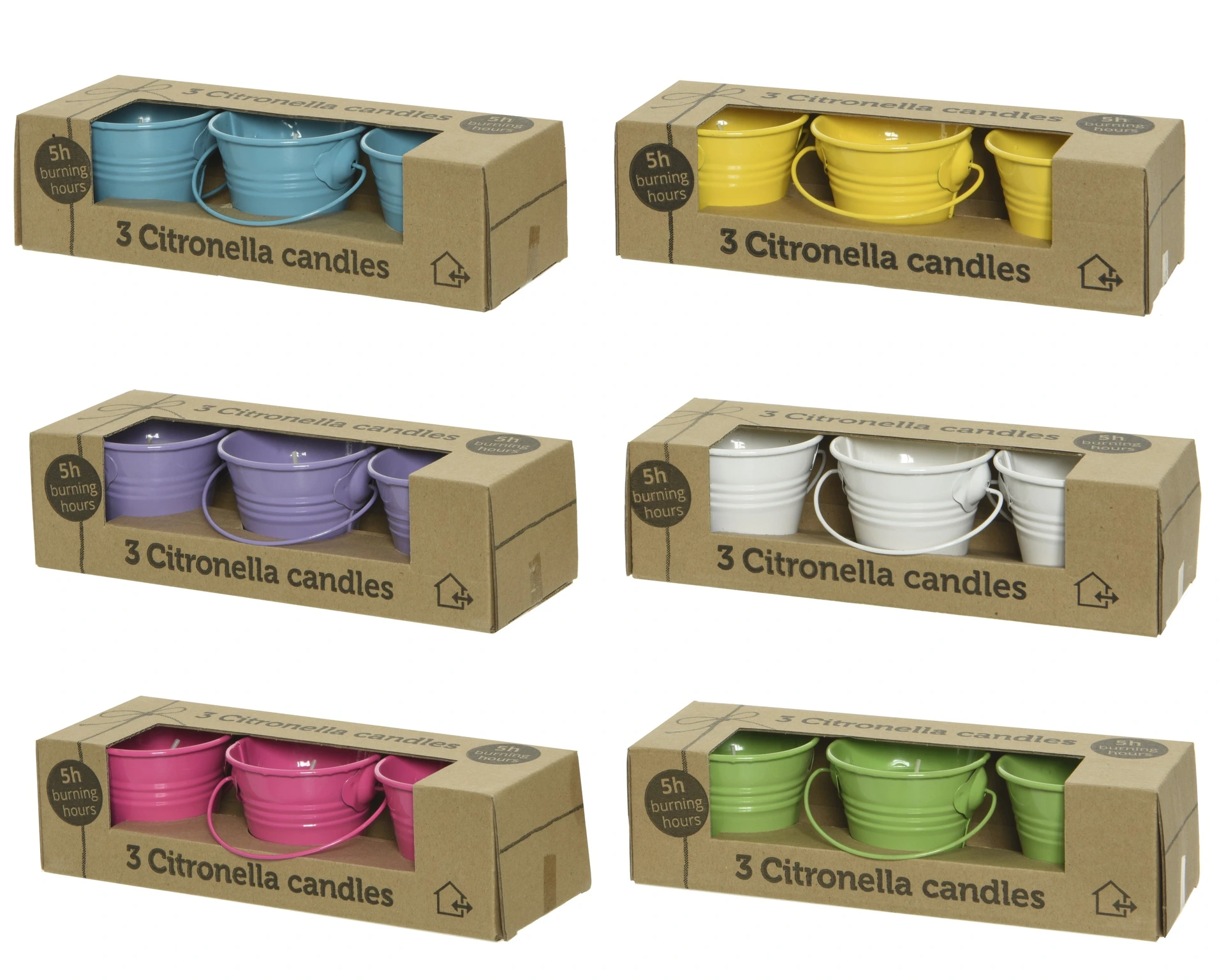Sultry summer evenings gain an extra warm and inviting atmosphere with these colorful citronella candles. This set consists of small candles, 5.5 cm high and 6.5 cm in diameter, poured in wax and placed in playful metal buckets. The multicolored design adds a cheerful, contemporary style to any balcony or outdoor space.
