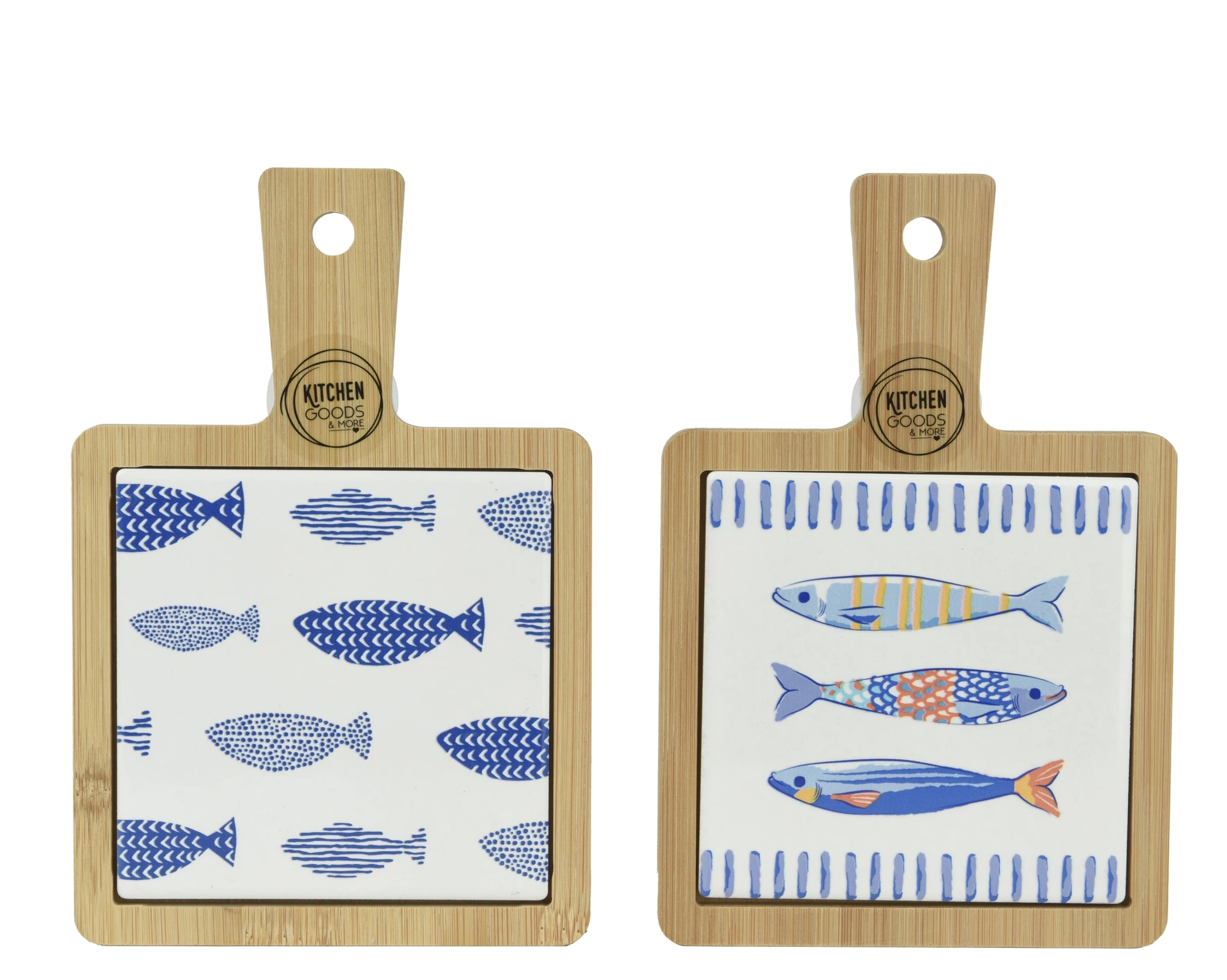 Bring a maritime atmosphere to your kitchen table with these charming cutting boards from Kitchen Goods. The combination of the porcelain cutting surface with a striking fish pattern and the wooden handle creates a fresh and natural look. With their compact size and blue details, they add a playful accent to your interior. These cutting boards are a perfect match for a contemporary, light kitchen style and are a pleasure to use.