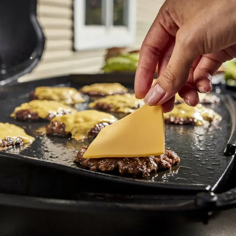 Transform your Weber® Q® barbecue into a griddle. Made with porcelain-enamelled cast iron, this griddle is non-stick and perfect for foods like eggs, bacon, smashed burgers, pancakes, delicate fish, and more. It evenly distributes heat across the surface for delicious and consistent results.
