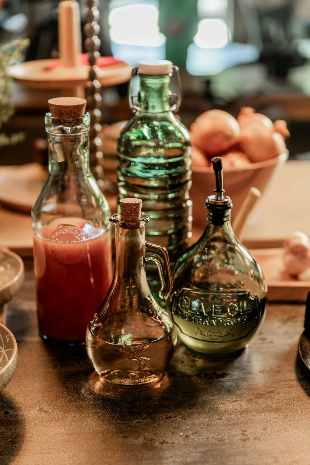 Oilbottle recycled glass green beige 2 assorted- h24xd12,5cm