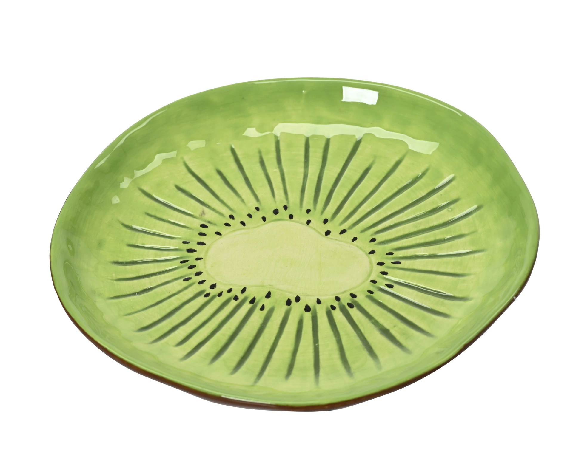 Bring a vibrant and fresh look to your dining moments with this striking kiwi plate from Kitchen Goods. The round plate, shaped like a kiwi, is made of glazed dolomite, providing a shiny, durable finish. The bright green with black accents instantly creates a summery atmosphere and adds a playful and stylish touch to your table. Thanks to its compact size of 15 cm in diameter, this plate is perfect for small bites or desserts in any setting.