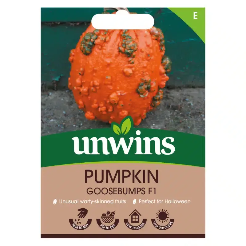 Unwins Pumpkin Goosebumps F1 are unusual warty-skinned fruits. They are perfect for Halloween. So if you're looking for the scariest pumpkin around, covered in dark lumps and bumps - Goosebumps is for you!
