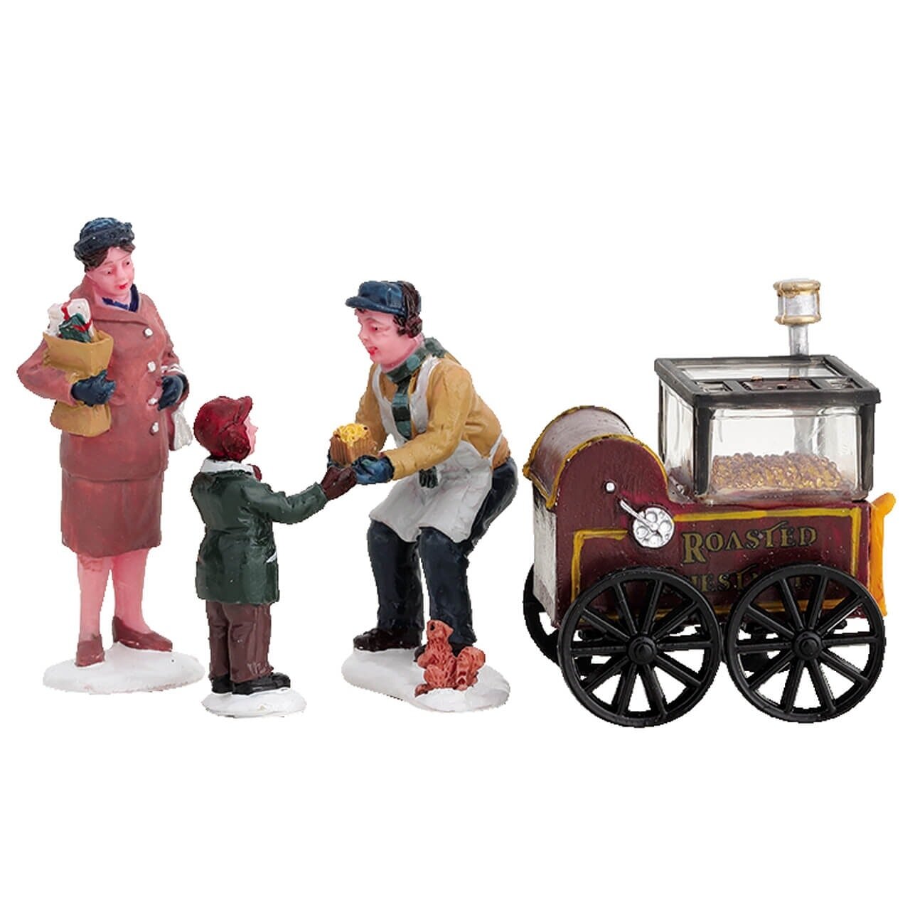 You can almost smell the wonderful aromas of chestnuts roasting over coals as depicted by this charming figurine. A welcome snack for the hungry shoppers in your miniature village, this Roasted Chestnut Stand will add interest to your festive scene and help bring it to life