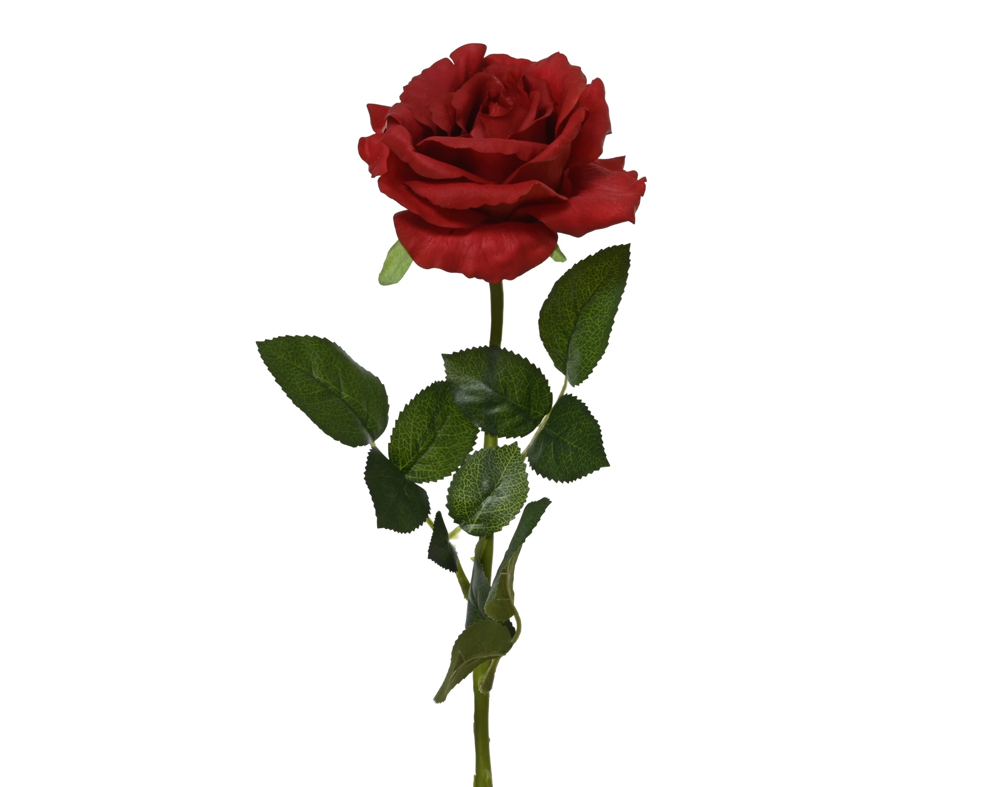 An enchanting red rose with a lifelike appearance, perfect for any interior. This single-stem artificial flower is 59 cm high and has a flower diameter of 13 cm. Made from high-quality polyester with a real touch finish, this rose combines style with easy maintenance. The classic red color scheme instantly brings atmosphere and elegance to living or work spaces. A modern yet timeless choice for long-lasting decoration.