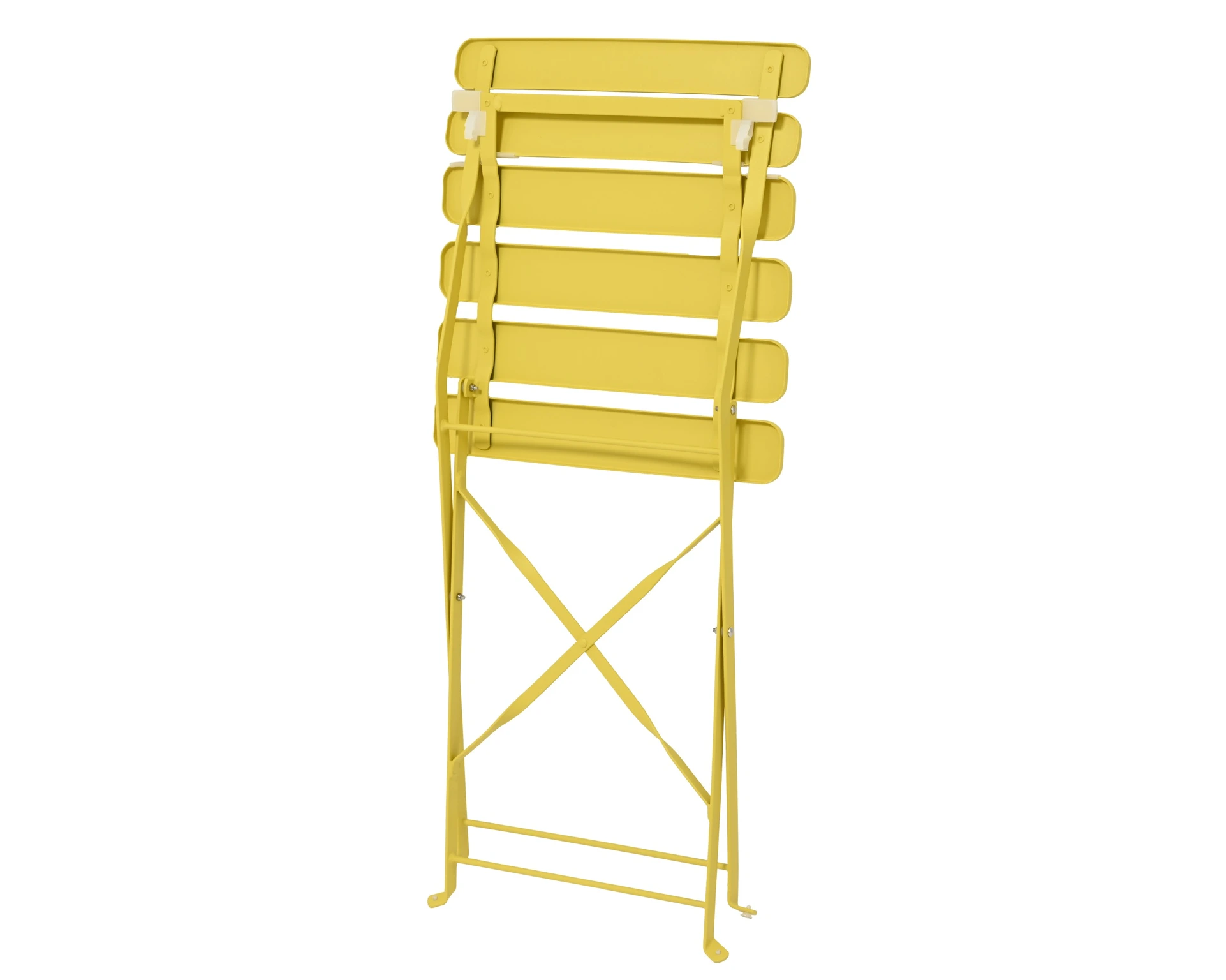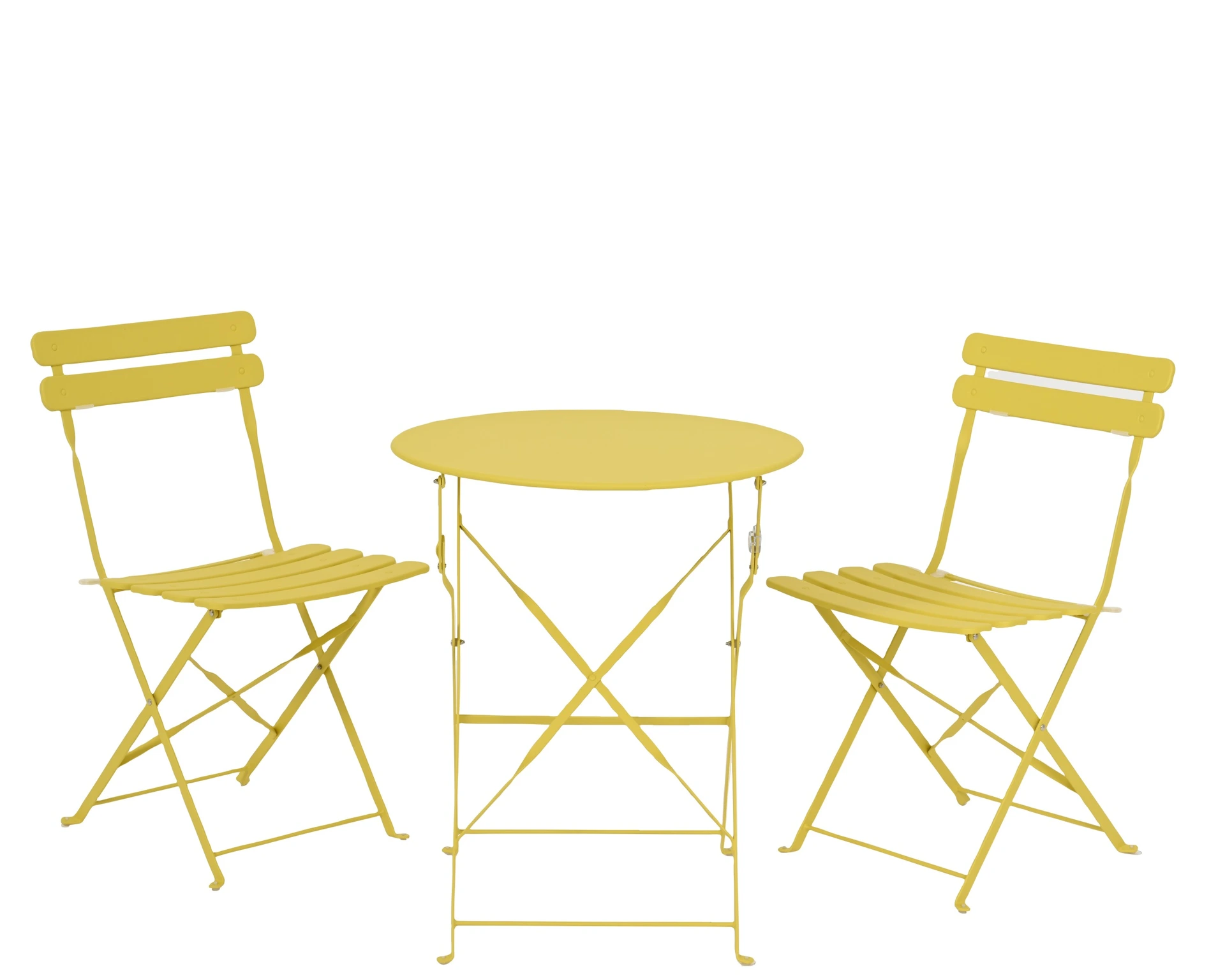 Summer evenings come alive with this striking bistro set, perfect for creating an intimate garden or balcony atmosphere. The set consists of a round table with a diameter of 60 cm and two matching chairs, each with a comfortable seat height of 45 cm. Made from sturdy steel in a bright yellow color, the furniture exudes a fresh and modern look. The easily foldable design makes it simple to store the set compactly or move it around.