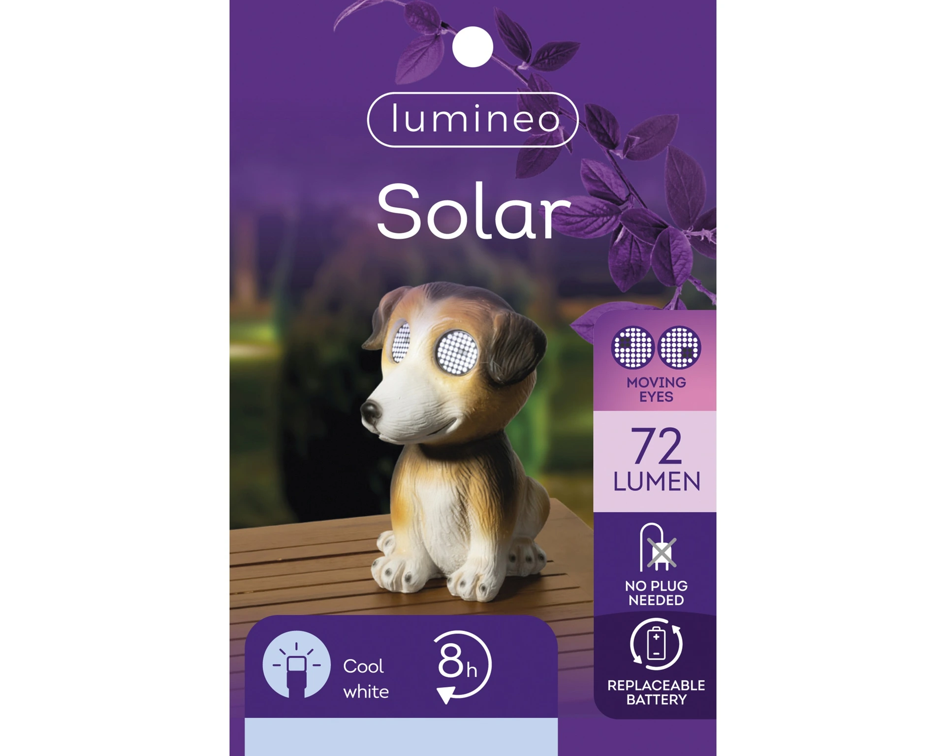 A cheerful addition to your garden, balcony, or patio that creates a playful and charming atmosphere. This colorful dog figure made of polyresin is fully powered by solar energy, with a built-in Li-ion battery that is easy to replace and provides up to 8 hours of cool white SMD LED light. Thanks to its user-friendly design and durable materials, this lamp adds functional coziness to any outdoor space. Its compact size ensures a subtle yet striking presence, enjoyable both during the day and in the evening.