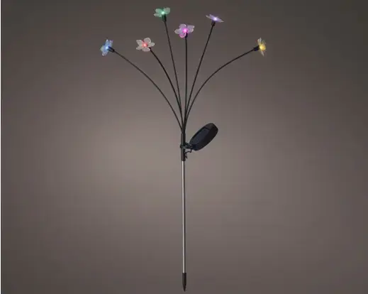 A magical addition for the garden, balcony, or terrace, where colorful flowers gently light up with an enchanting firefly effect. This stylish black garden stake runs on solar energy and is equipped with six multi-color LEDs that spread atmospheric light for up to 6 hours. Thanks to the durable plastic material and the use of a replaceable AAA battery, this lamp provides comfort and long-lasting illumination without the hassle of cables. Ideal for creating a lively and inviting atmosphere during sultry summer evenings.