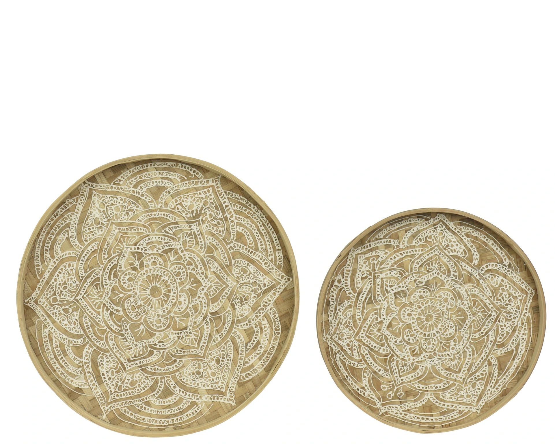 The white, handmade pattern creates a refined look that effortlessly complements both modern and rustic styles. Use these trays to add stylish accents to your dining table or buffet and enjoy the warm, natural character they bring to any space.
