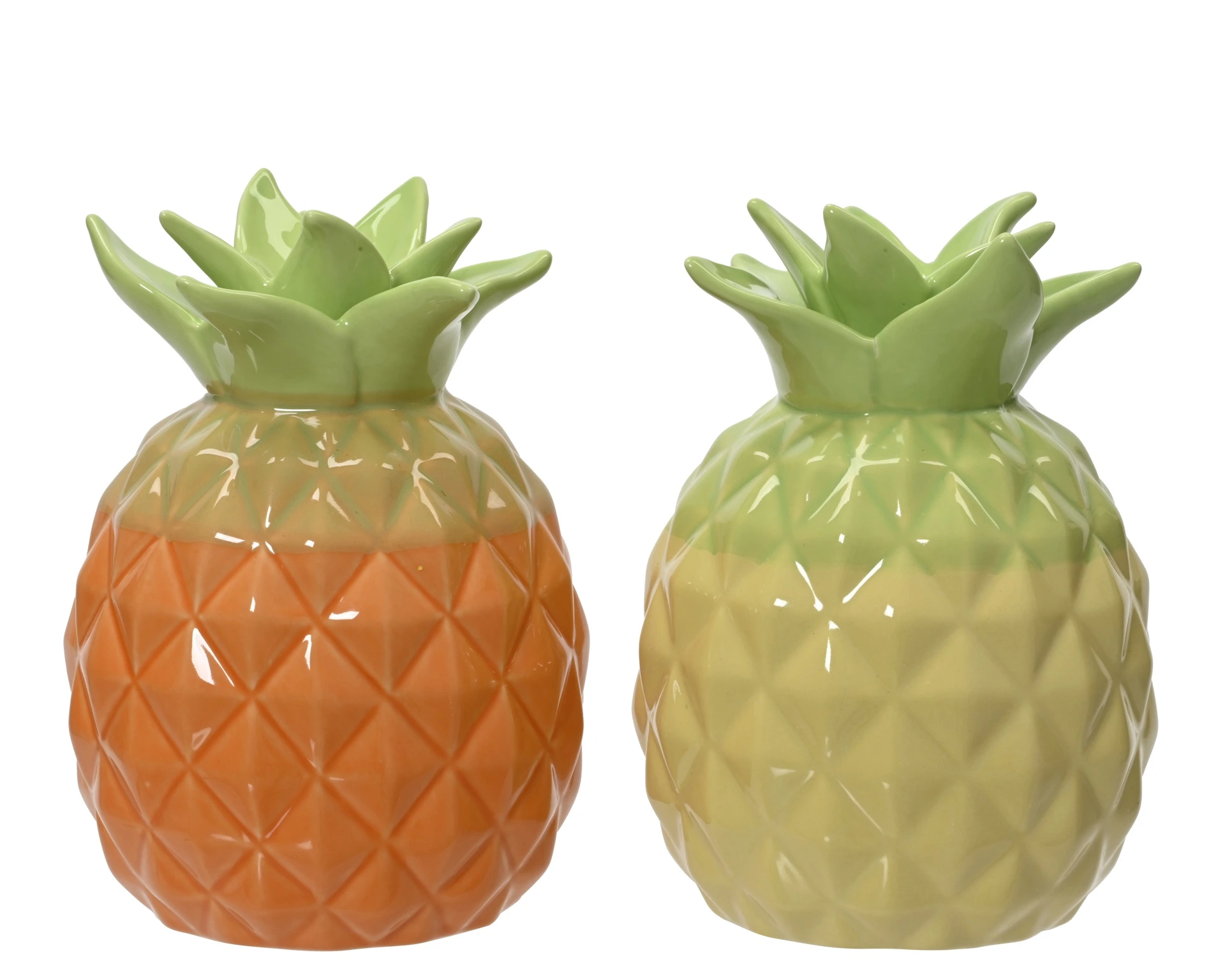 Bring a tropical vibe into your home with this charming vase set from Decoris. The vases are shaped like pineapples and feature a playful color gradient in soft green, yellow, and orange hues. Made of high-quality porcelain with a glossy finish, they make a striking decoration for the windowsill, sideboard, or dining table. Their modern and fresh appearance fits perfectly with a contemporary interior.