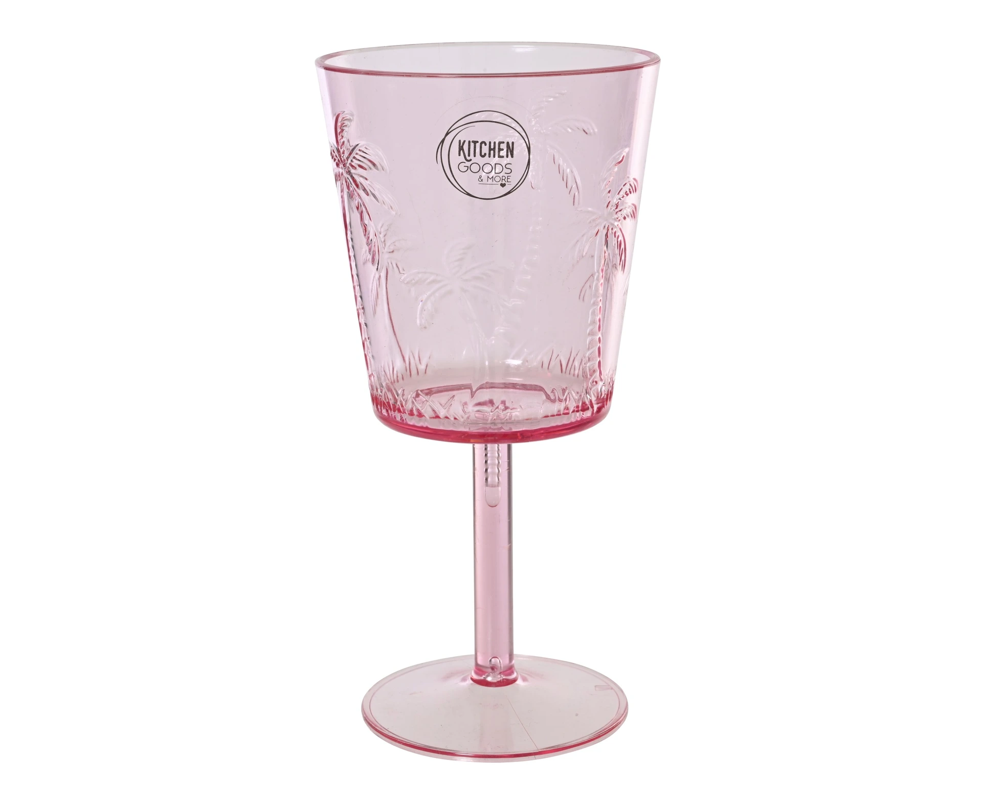 Add a playful touch to your table with this pink wine glass from Kitchen Goods. The stylish design features a pronounced palm decoration that gives the glass a tropical and soft appearance. This plastic wine glass combines elegance with a lighthearted atmosphere and is perfect for indoor use. With a height of 18.5 cm and a diameter of 9 cm, it is comfortable to hold and makes a striking addition to any table setting.